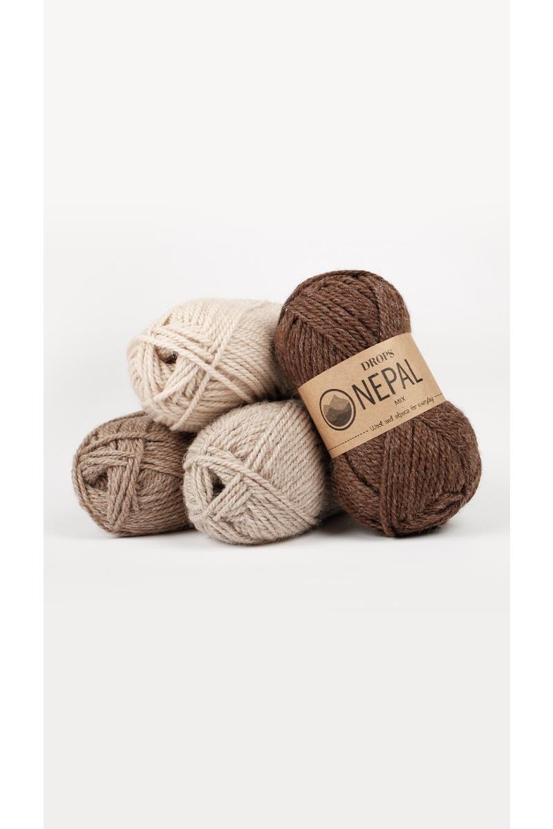 Blandingen fremhever alpakkaens silkemyke overflate, samtidig som ullen bidrar til bedre formstabilitet . Kvaliteten er spunnet sammen av 3 tråder, hvilket gir et spennende, rustikt og flott maskebilde. DROPS Nepal er en lettstrikket kvalitet og på pinne nr 5 går det fort å strikke selv store plagg. DROPS Nepal egner seg særdeles godt til toving. Plaggene får etter tovingen en jevn og myk overflate.