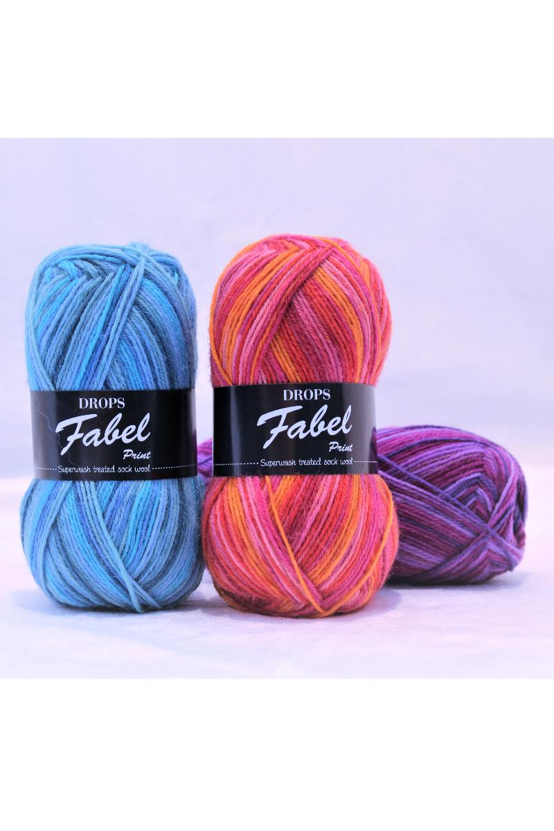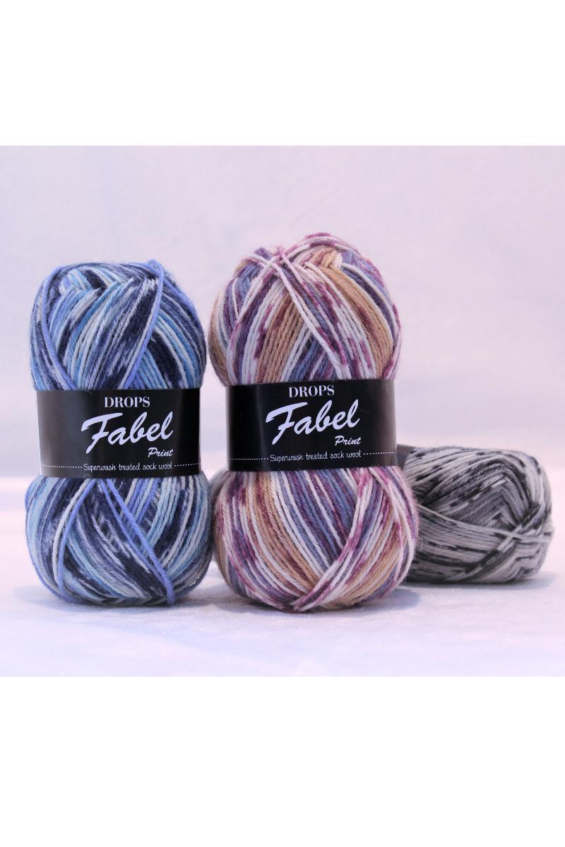Med et av de største fargekartene i DROPS sortimentet, har DROPS Fabel tre garnvarianter som gir plagget forskjellige resultater: uni colour, som er ensfarget; print, der varierte farger repeteres regelmessig og long print, lik som print men med lengre repetisjoner av hver farge. Både print og long print er farget med en metode som kalles “fancy dyeing” som er forskjellig fra andre metoder ettersom det i hvert fargeparti er små variasjoner i både mønster og nyanse. Dette er ikke en feil, men en del av garnets egenskaper.