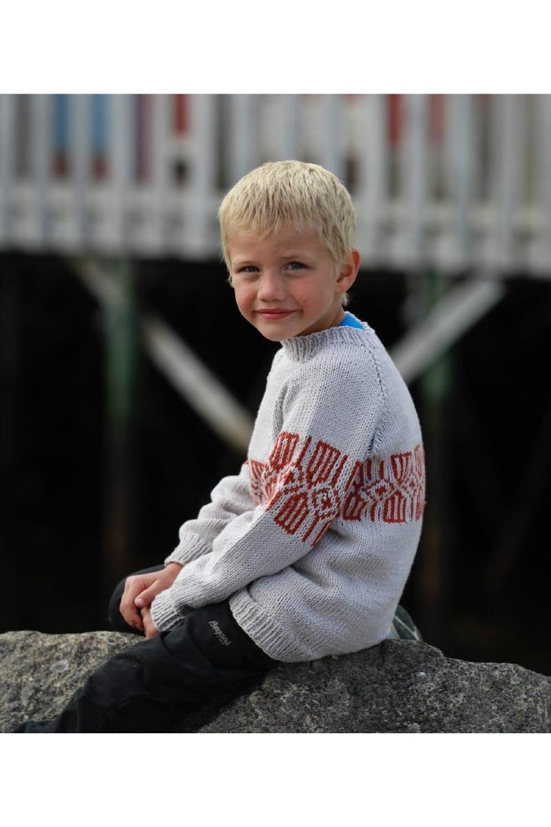 Denne genseren er en unisex modell, med et retro mønser over bol og øverst på ermer. Den strikkes nedenfra og opp, med klassisk raglanfelling. Den har romslig passform, slik at det blir plass til å ha en trøye under. Man kan velge å strikke genseren lengre nederst, bak på bolen for å få enda bedre passform, og unngå at genseren sklir opp når barnet er i aktivitet.