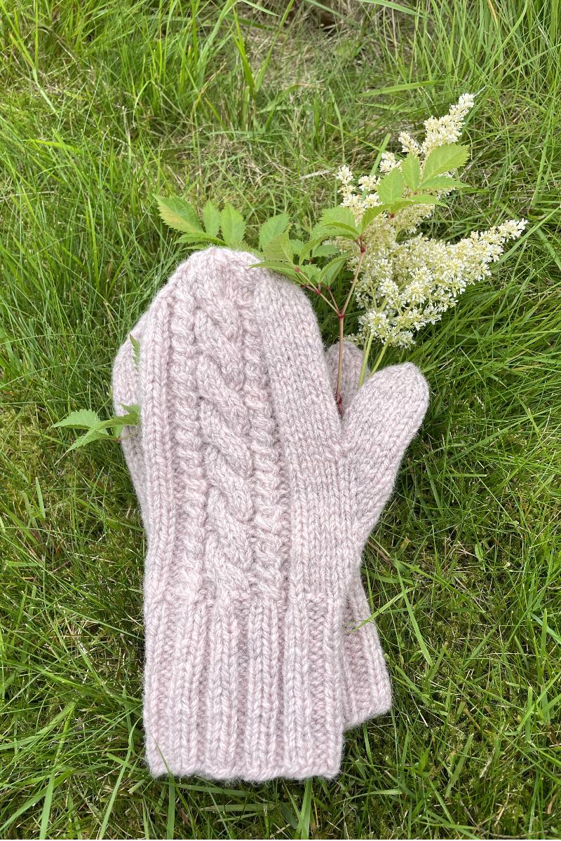 De er strikket i dobbel finull fra Rauma garn. Den unike tommelkilen, sammen med flettemønstret gir en veldig god passform. Vottene kan justeres på lengde etter ønske, og oppleves de store i størrelsen kan de, med fordel, toves lett.