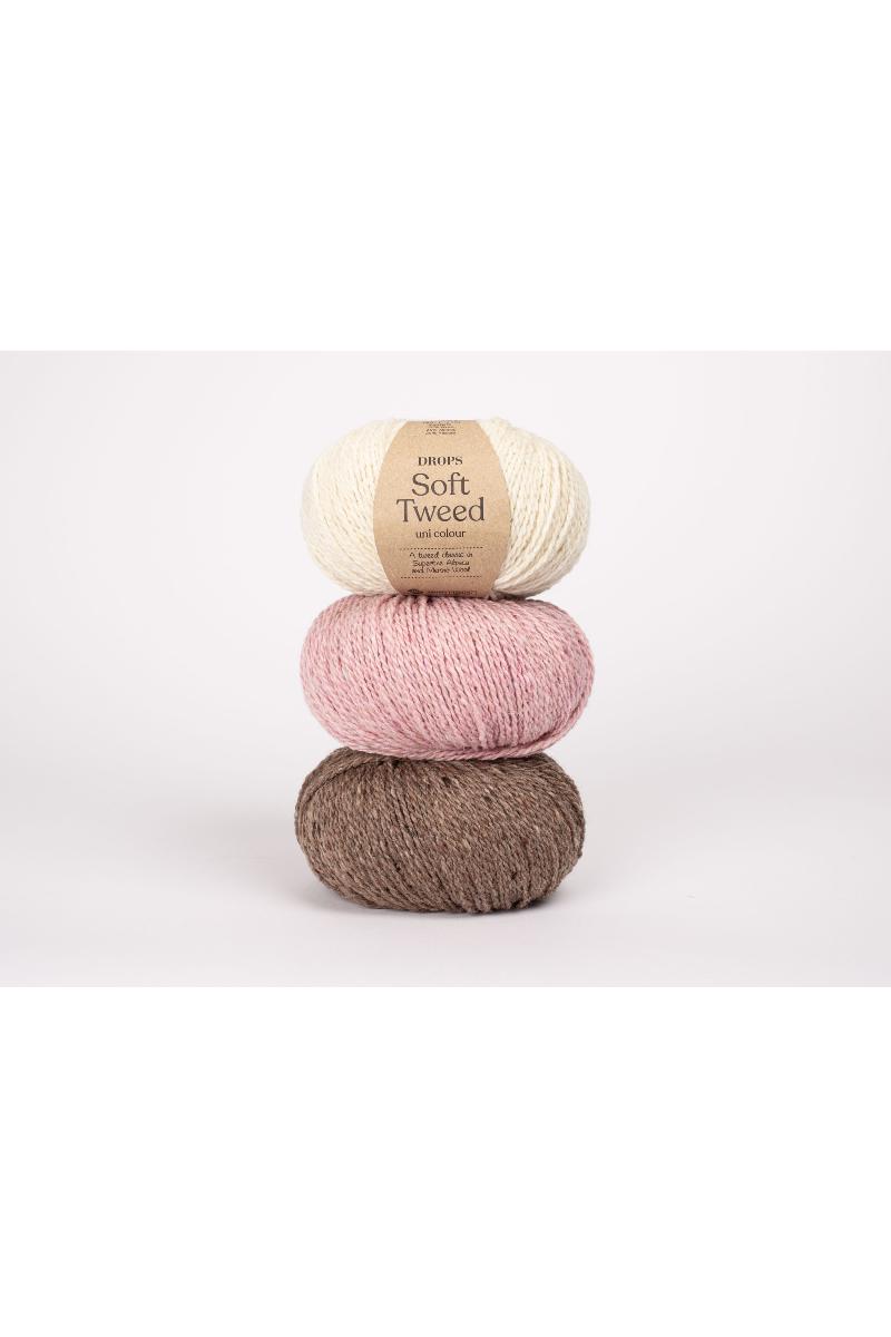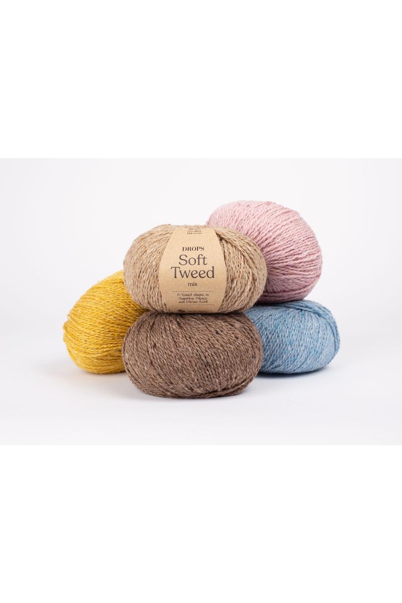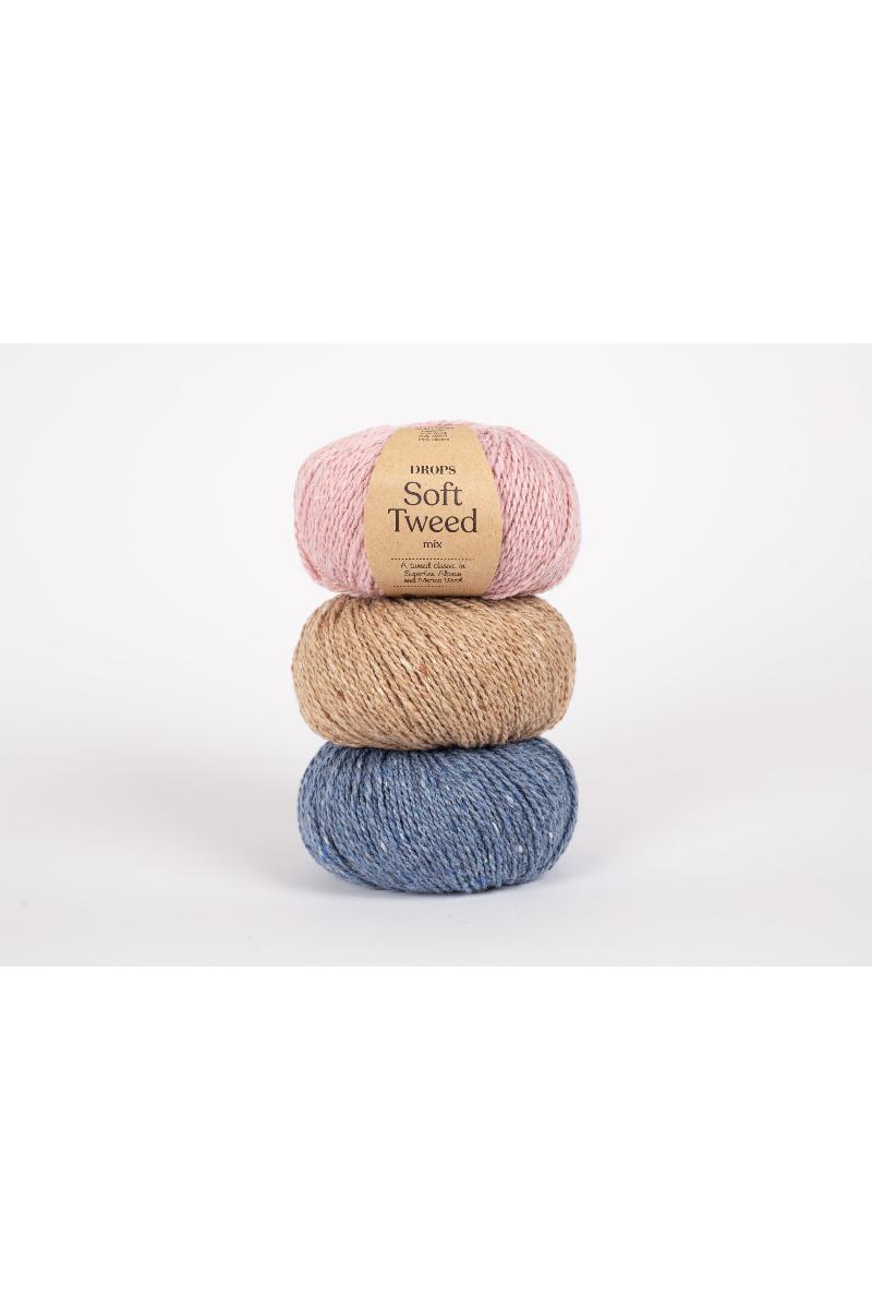 DROPS Soft Tweed er som navnet tilsier et supermykt tweedgarn, laget i en kombinasjon av merinoull, superfin alpakka og viskose. Garnet produseres ved å karde fibrene sammen med små tovede "tweed knapper" som gir et fargespill som definerer utseendet på denne kvaliteten.