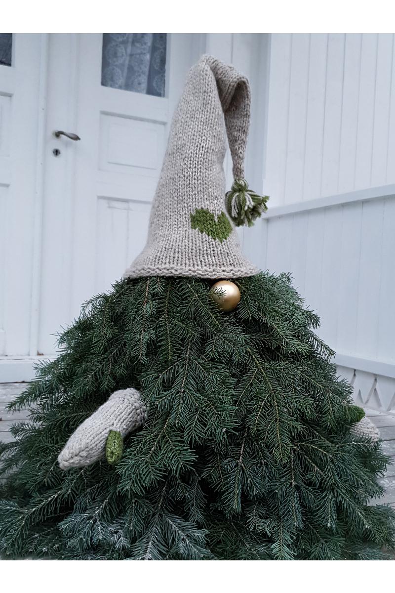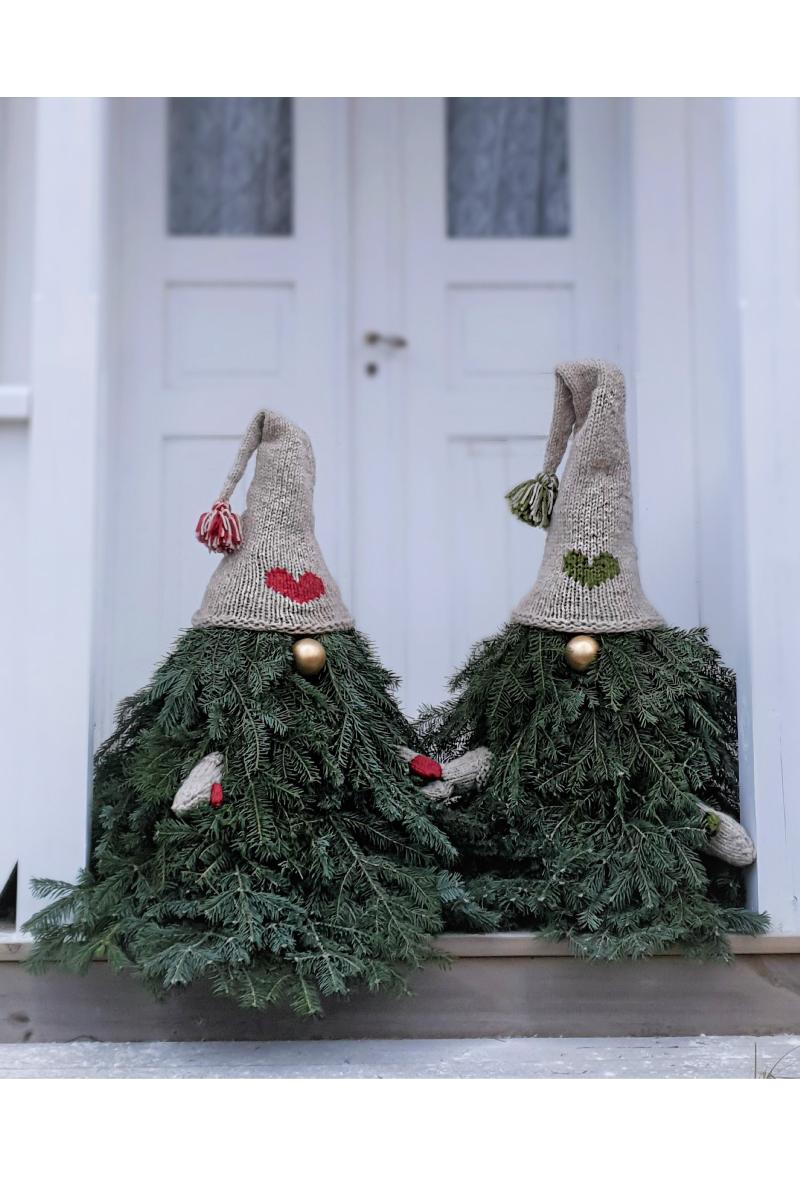 For noen år siden kom jeg på ideen om å lage mønster til luer og votter til granbarnisser. Det har blitt en tradisjon å lage granbarnisser, og hente fram luene og vottene for å pynte opp utenfor huset til jul. Her i gården heter de Trine og Morten nissene.