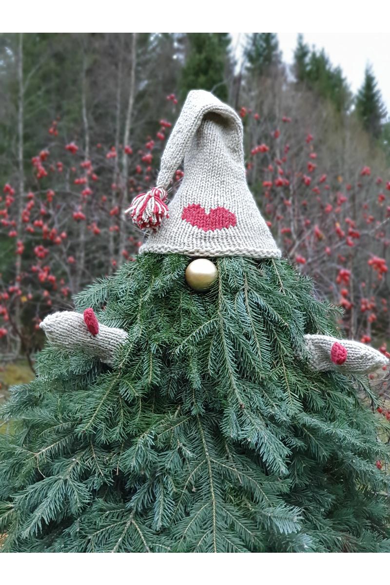 For noen år siden kom jeg på ideen om å lage mønster til luer og votter til granbarnisser. Det har blitt en tradisjon å lage granbarnisser, og hente fram luene og vottene for å pynte opp utenfor huset til jul. Her i gården heter de Trine og Morten nissene.