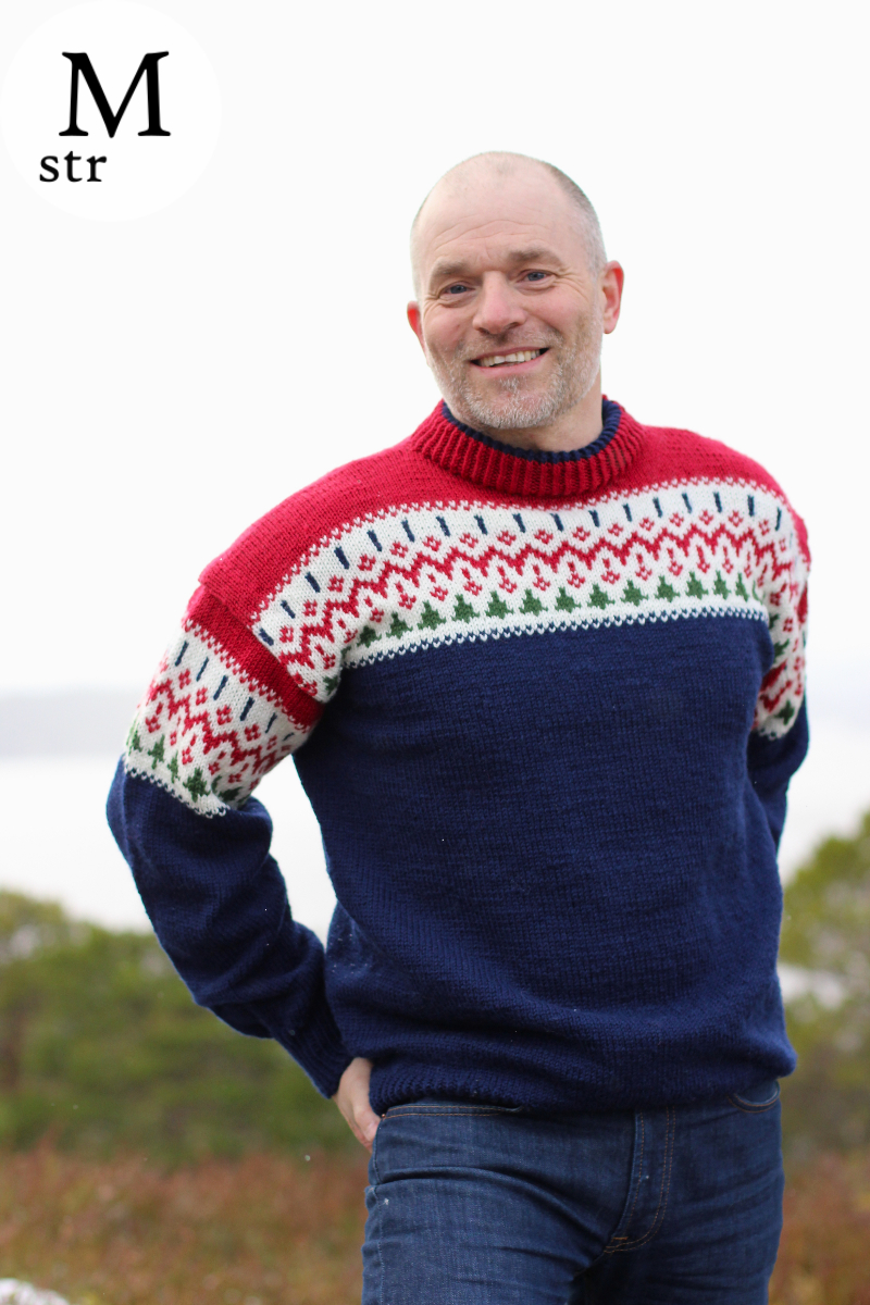 Spillum ligger vakkert til utenfor Namsos, like ved utløpet av lakseelva Namsen. Her er det flott natur med både elv, sjø og fine fjell i området. Sagbruk har vært en vesentlig del av grunnlaget for bosetting, og det eldste sagbruket i området ble etablert på Spillum. Sagbruk og bruk av trevirke som ressurs var viktig for utviklingen i området. Etter hvert ble det skipet ut blant annet skolehus til flere steder i Norge fra sagbruk her omkring. Når den fine garnbutikken Garnprat ble etablert fikk jeg ideen om å designe en genser, og min inspirasjon til mønster har vært trær, tømmer og hus. Mønsteret er en hyllest til Spillum, og til skogen som en fornybar ressurs, som har vært viktig i generasjoner. I mønsteret er trærne grønne, husene midt i mønsteret er i rødt og tømmeret øverst i mønsteret i blått.