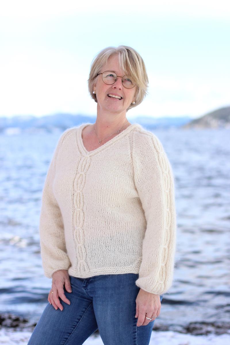 Jukseflettene ble til for at alle som ikke liker å strikke fletter, kan få til et plagg med «flettemønster». Og den lille splitten i siden, og at den er sidere bak. Er en fin liten detalj.