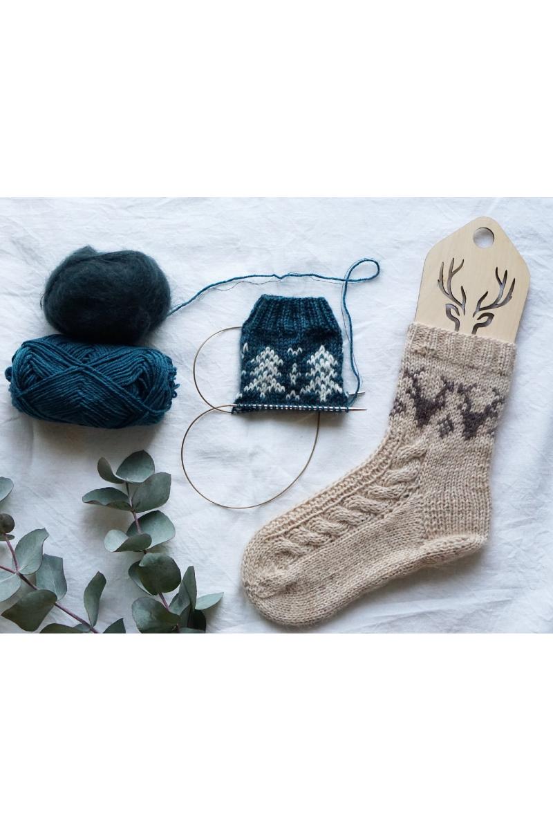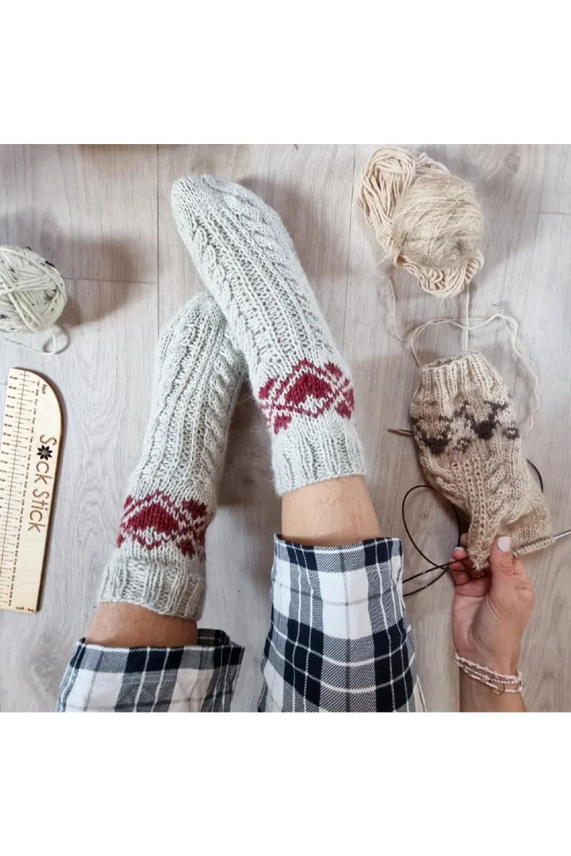 sofaen med, sammen med en stor kopp kakao på kalde vintermorgener. Sokken strikkes med tradisjonelle vinter/julemotiv på skaftet. Etter skaftet kan man for junior/damestørrelse velge om man vil strikke sokken videre med strukturstrikk, eller ha resten av sokken i glattstrikk. Herresokken strikkes med mønster på skaftet, og resten av sokken strikkes i glattstrikk. For junior/damestørrelsen kan man også velge om man ønsker en moderat lengde på sokken før hæl, eller ekstra lengde.