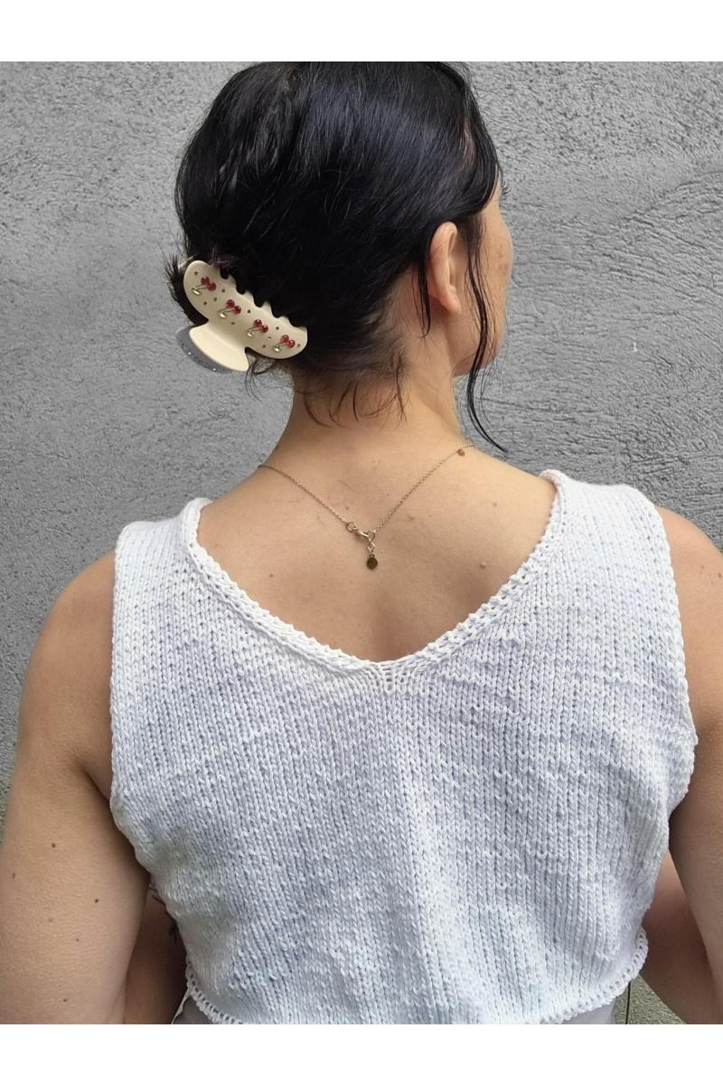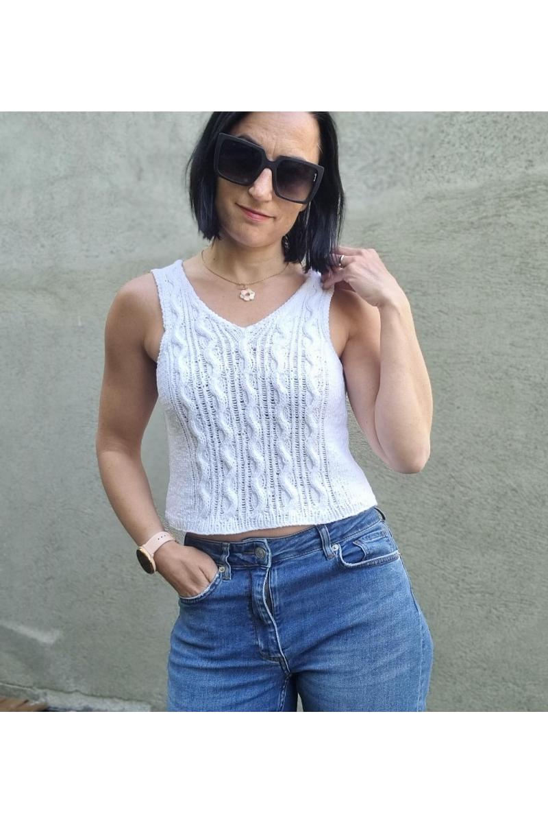 Tidevanntank strikkes i lin eller bomull for et svalt og godt sommerplagg. Toppen kan også fint brukes under en skjorte eller cardigan hele året. Toppen strikkes ovenfra og ned, og man legger opp med midlertidig opplegg, slik at man enkelt kan justere lengden på stroppene underveis, ut ifra ønsket passform og dybde på ermehull. Toppen strikkes med struktur på fremsiden, som blir beskrevet med diagram, og glattstrikk på ryggen. Kombinasjonen av fletter, og vrangbord med vridd rett mellom, gir en akkurat passelig luftig « look », uten at den blir for gjennomsiktig.